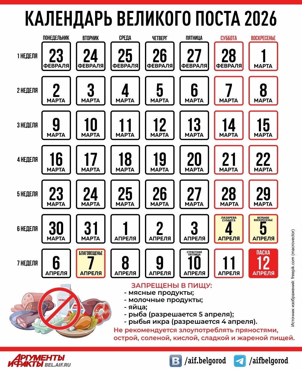 В 2026 году Великий пост продлится с 23 февраля по 12 апреля. От каких продуктов верующим нужно отказаться и в какие дни разрешена рыба — в инфографике «АиФ».