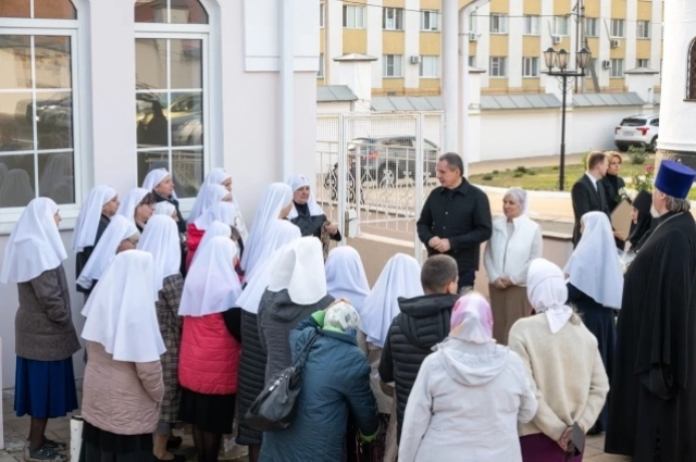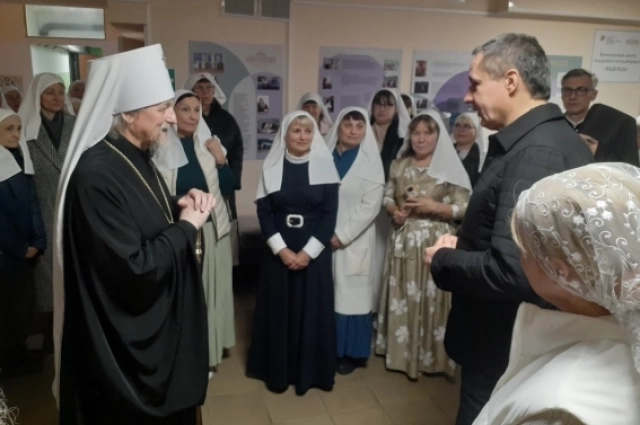 Старшая сестра Марфо-Мариинского сестричества милосердия Елена Химченко рассказала и показала главе региона, где и как работает сестричество. В корпусе ежедневно ведут приём нуждающихся, есть пункт выдачи гуманитарной помощи, склад с вещами и предметами первой необходимости, детский уголок, кухня, есть и несколько спальных мест. Здесь в корпусе собираются сестры для бесед со своим духовником, настоятелем Свято-Никольского храма, протоиереем Сергием Клюйко — именно он по благословению Владыки Иоанна в далеком 1995 году основал сестричество милосердия, деятельность которого расширялась с каждым годом: начинали его 30 человек, сейчас сестер более 130. Сестры несут послушания в больницах, помогают инвалидам, престарелым, осуждённым, помогают каждому, кто просит о помощи.