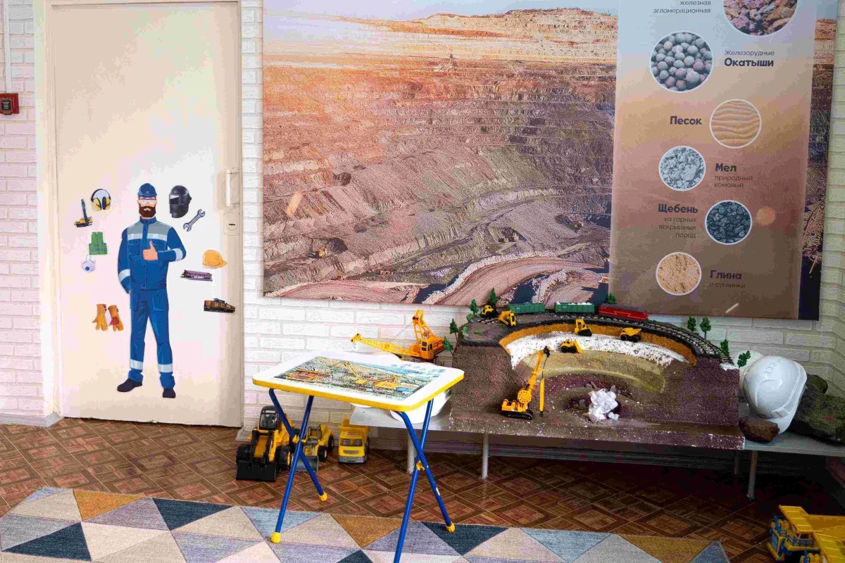 Здесь разместили макет карьера, информационные стенды, альбомы с фотографиями и рассказами о работягах, образцы горных пород и готовой продукции, а также учебные материалы. Воспитатели в игровой форме рассказывают детям о таких профессиях, как горный мастер, водитель больших грузовиков, машинист экскаватора и электровоза, лаборант, диспетчер.