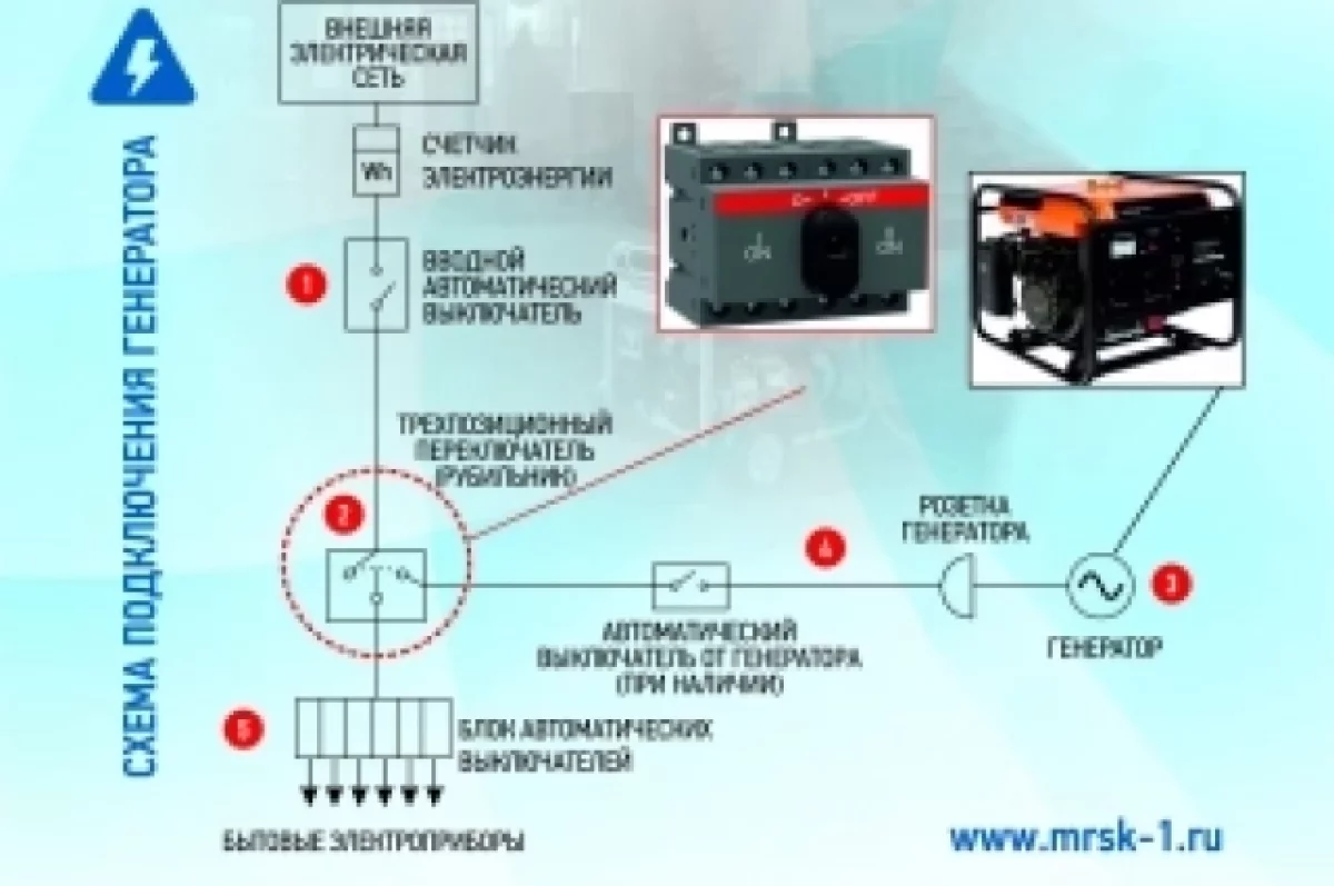 - переключить трехпозиционный выключатель (при наличии) в режим получения электроэнергии от резервного источника электроснабжения (генератора);