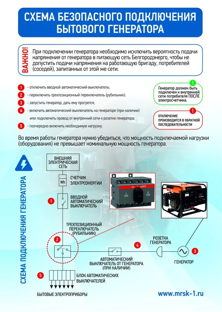 Филиал «Россети Центр» - «Белгородэнерго» напоминает потребителям, устанавливающим индивидуальные дизельные и бензиновые генераторы, что подключать их нужно четко в соответствии с инструкцией и обязательно после электросчетчика. Это необходимо для того, чтобы исключить электроэнергию, выработанную генератором, из расчетных платежей.