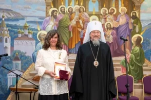 Во время литературной гостиной 3 апреля Владыка вручил Татьяне Черных, в числе других юбиляров, награду митрополии.